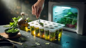 - 🕒 A true five-minute method: chop dry herbs, fill silicone trays, cover with extra-virgin oil (roughly 1:1), freeze, then store in labelled bags or boxes.